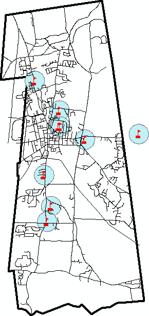 | Streets and railroads, voting precincts (blue), and K-12 schools. |