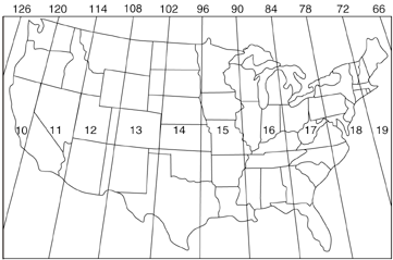 The Earth is divided into sixty narrow north-south strips, each six degrees of longitude wide and extending from 80° S. Latitude to 84° N. Latitude: