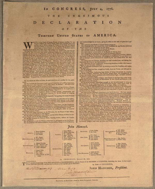 In Congress, July 4, 1776. The unanimous declaration of the Thirteen United States of America. When in the Course of human events, it becomes necessary for one people to dissolve the political bands which have connected them with another, and to assume among the powers of the earth, the separate and equal station to which the Laws of Nature and of Nature's God entitle them, a decent respect to the opinions of mankind requires that they should declare the causes which impel them to the separation. We hold these truths to be self-evident, that all men are created equal, that they are endowed by their Creator with certain unalienable Rights, that among these are Life, Liberty and the pursuit of Happiness,—That to secure these rights, Governments are instituted among Men, deriving their just powers from the consent of the governed,—That whenever any Form of Government becomes destructive of these ends, it is the Right of the People to alter or to abolish it, and to institute new Government, laying its foundation on such principles and organizing its powers in such form, as to them shall seem most likely to effect their Safety and Happiness. Prudence, indeed, will dictate that Governments long established should not be changed for light and transient causes; and accordingly all experience hath shewn, that mankind are more disposed to suffer, while evils are sufferable, than to right themselves by abolishing the forms to which they are accustomed. But when a long train of abuses and usurpations, pursuing invariably the same Object evinces a design to reduce them under absolute Despotism, it is their right, it is their duty, to throw off such Government, and to provide new Guards for their future security.—Such has been the patient sufferance of these Colonies; and such is now the necessity which constrains them to alter their former Systems of Government. The history of the present King of Great Britain is a history of repeated injuries and usurpations, all having in direct object the establishment of an absolute Tyranny over these States. To prove this, let Facts be submitted to a candid world. He has refused his Assent to Laws, the most wholesome and necessary for the public good. He has forbidden his Governors to pass Laws of immediate and pressing importance, unless suspended in their operation till his Assent should be obtained; and when so suspended, he has utterly neglected to attend to them.…We, therefore, the Representatives of the united States of America, in General Congress, Assembled, appealing to the Supreme Judge of the world for the rectitude of our intentions, do, in the Name, and by Authority of the good People of these Colonies, solemnly publish and declare, That these United Colonies are, and of Right ought to be Free and Independent States; that they are Absolved from all Allegiance to the British Crown, and that all political connection between them and the State of Great Britain, is and ought to be totally dissolved; and that as Free and Independent States, they have full Power to levy War, conclude Peace, contract Alliances, establish Commerce, and to do all other Acts and Things which Independent States may of right do. And for the support of this Declaration, with a firm reliance on the protection of divine Providence, we mutually pledge to each other our Lives, our Fortunes and our sacred Honor. John Hancock. Georgia: Button Gwinnett, Lyman Hall, George Walton. North Carolina: William Hooper, Joseph Hewes, John Penn. South Carolina: Edward Rutledge, Thomas Heyward, Jr., Thomas Lynch, Jr., Arthur Middleton. Maryland: Samuel Chase, William Paca, Thomas Stone, Charles Carrol,l of Carrollton. Virginia: George Wythe, Richard Henry Lee, Thomas Jefferson, Benjamin Harrison, Thomas Nelson, Jr., Francis Lightfoot Lee, Carter Braxton. Pennsylvania: Robert Morris, Benjamin Rush, Benjamin Franklin, John Morton, George Clymer, James Smith, George Taylor, James Wilson, George Ross. Delaware: Caesar Rodney, George Read, Thomas McKean. New York: William Floyd, Philip Livingston, Francis Lewis, Lewis Morris. New Jersey: Richard Stockton, John Witherspoon, Francis Hopkinson, John Hart, Abraham Clark. New Hampshire: Josiah Bartlett, William Whipple, Matthew Thornton. Massachusetts Bay: Samuel Adams, John Adams, Robert Treat Paine, Elbridge Gerry. Rhode Island & Providence, &c.: Stephen Hopkins, William Ellery. Connecticut: Roger Sherman, Samuel Huntington, William Williams, Oliver Wolcott. In Congress, January 18, 1777. Ordered, That an authenticated Copy of the Declaration of Independency, with the Names of the Members of Congress, subscribing the same, be sent to each of the United States, and that they be desired to have the same put on Record. By Order of Congress, John Hancock, President. Baltimore, in Maryland: Printed by Mary Katharine Goddard.